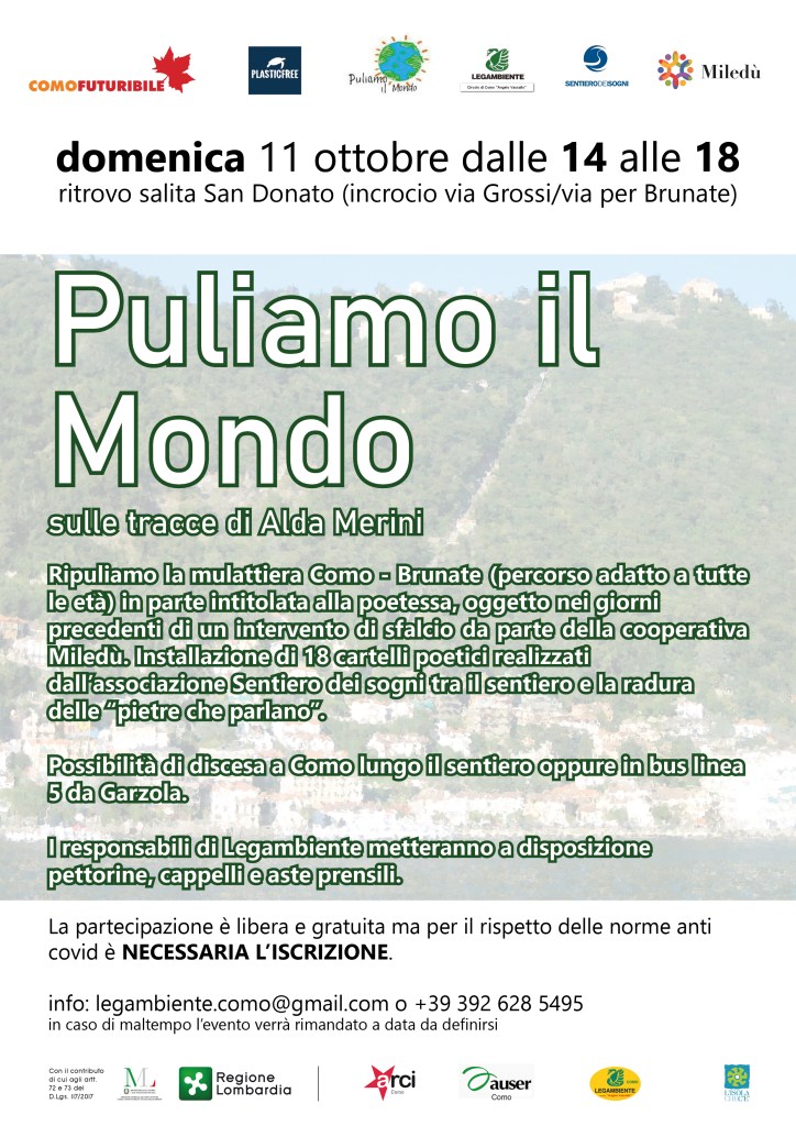 Continuano gli appuntamenti con il circolo Angelo Vassallo di Legambiente Como per “Puliamo il mondo”. L’11 ottobre si visiterà la mulattiera Como-Brunate (sentiero adatto per tutte le età), in parte dedicata alla grande poetessa del Novecento, che verrà omaggiata con l’installazione dei cartelli poetici da parte dell’associazione Sentiero dei sogni.