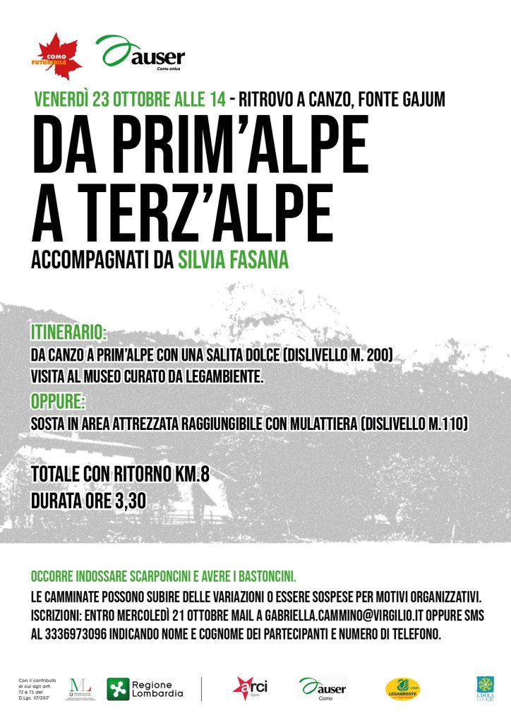 Venerdì 23 ottobre alle 14 si svolgerà un’altra delle camminate di Auser volontariato Como in programma per il progetto Como futuribile. L’itinerario sarà da Prim’Alpe a Terz’Alpe, sopra Canzo, sotto i famosi “corni”. L’iniziativa è inserita nel cartellone del progetto Como futuribile di Arci Como, Auser volontariato Como, L’isola che c’è e Legambiente Como.