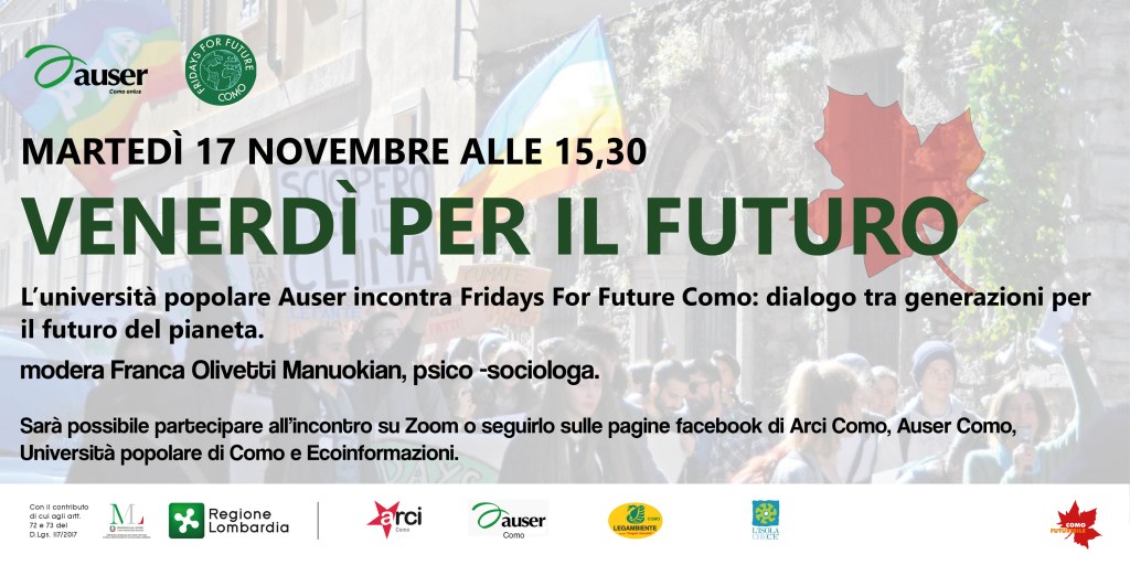 Martedì 17 novembre alle 15,30 l’Università popolare Auser incontra online Fridays for future Como. Un momento di confronto generazionale sui temi ambientali e sul futuro del pianeta, con Franca Olivetti Manoukian, psico-sociologa.