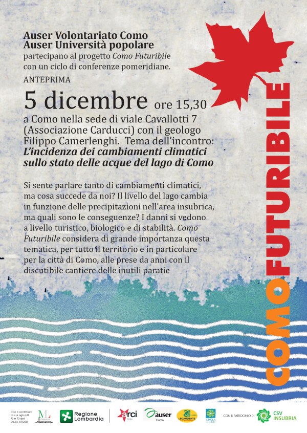 Auser Volontariato Como e Auser Università popolare partecipano al progetto Como Futuribile, con un ciclo di conferenze pomeridiane. Anteprima il 5 dicembre alle 15,30, nella sede di viale Cavallotti 7 (Ass.ne Carducci) con il geologo Filippo Camerlenghi. Tema dell’incontro, l’incidenza dei cambiamenti climatici sullo stato delle acque del lago di Como.